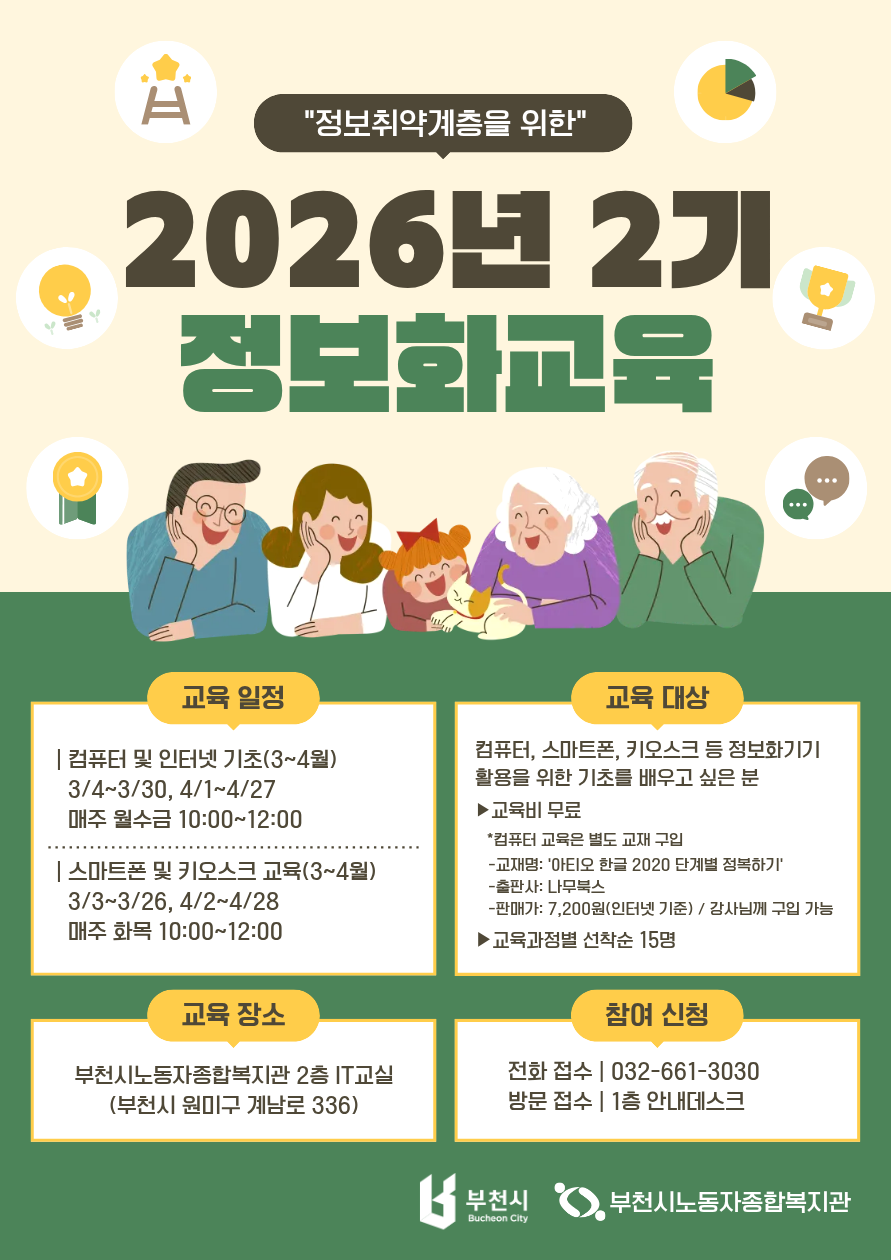 2026년 정보화교육 2기(3~4월) 수강생을 모집합니다. 컴퓨터, 스마트폰, 키오스크 등 일상 속 정보화기기를 쉽고 편리하게 활용할 수 있도록 기초부터 함께 배우는 시간입니다. 많은 관심 부탁드립니다.