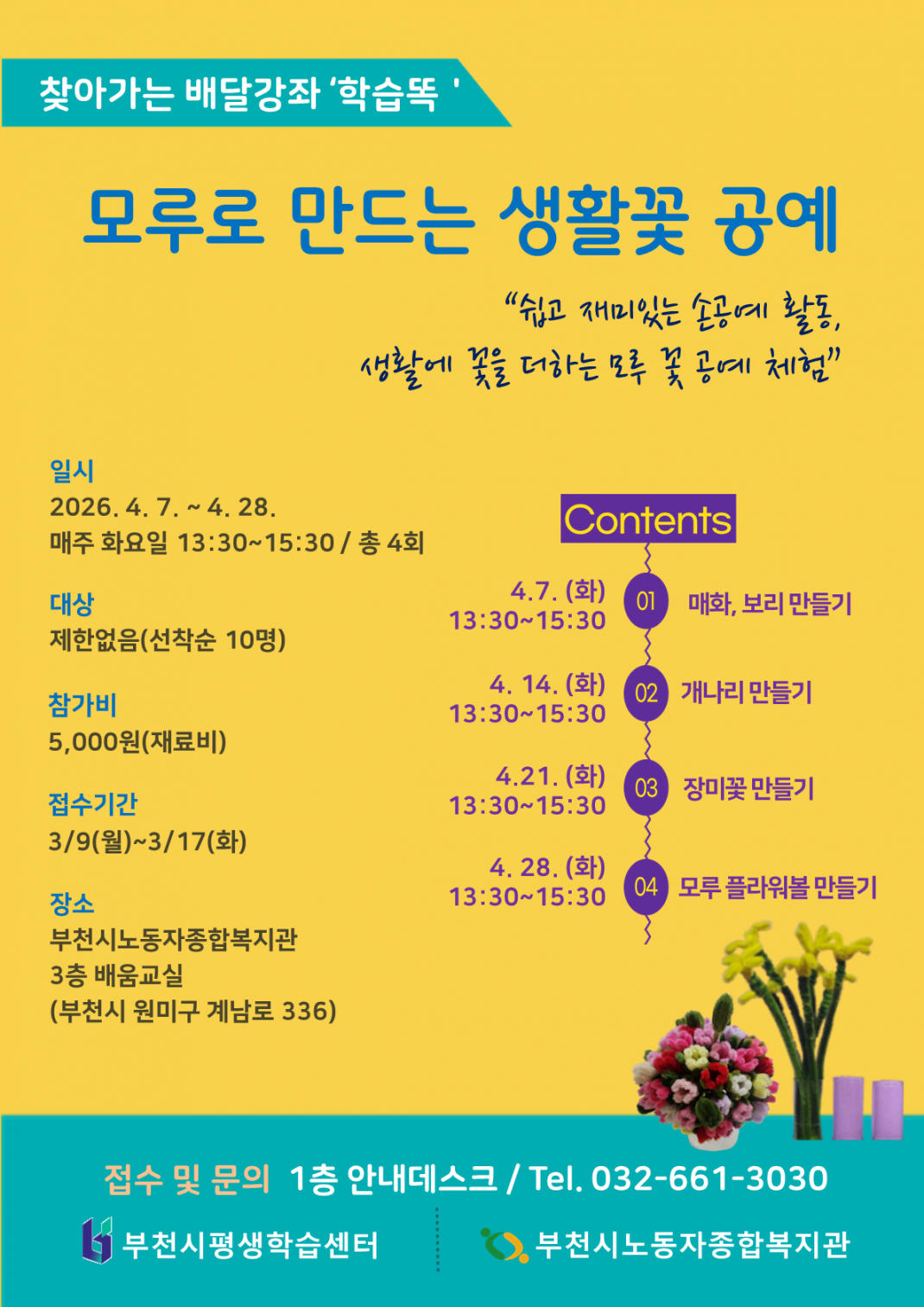 "쉽고 재미있는 손공예 활동, 생활에 꽃을 더하는 모루 꽃 공예 체험"에 많은 관심과 참여 바랍니다.