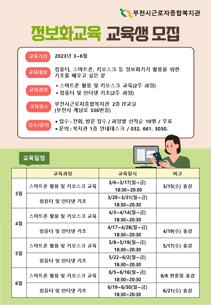 본 교육은 지역별·계층별 정보격차를 해소하기 위해 정보취약계층을 대상으로 정보화교육을 시실하는 부천시 지원사업입니다. 컴퓨터, 스마트폰, 키오스크 등 정보화기기 활용을 위한 기초를 배우고 싶으신 분들의 많은 관심과 참여 바랍니다.
