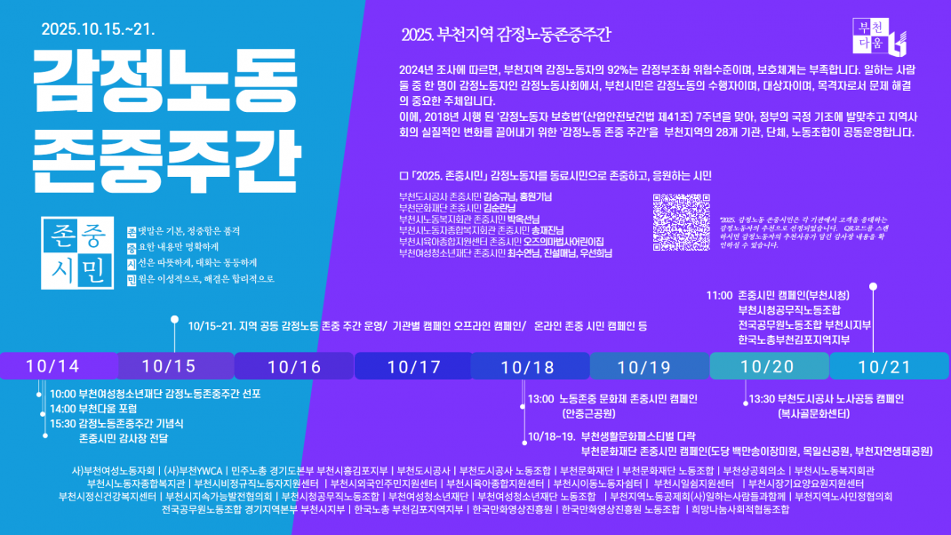 부천지역 감정노동존중 주간은 '감정노동자 보호법(산업안전보건법 제41조) 제정일 7주년을 맞아 부천 지역사회가 감정노동 존중을 당연한 가치로 확산하기 위해 공동 운영합니다. 모두가 감정노동을 주고받는 '감정노동사회' 속에서 일하는 사람이 안전하고 행복한 도시, 감정노동을 존중하는 부천시를 만들기 위해 일하는 모든 분들이 존중받고 서로의 감정을 이해하는 문화를 만들어 가고자 하오니 많은 관심 부탁드립니다.