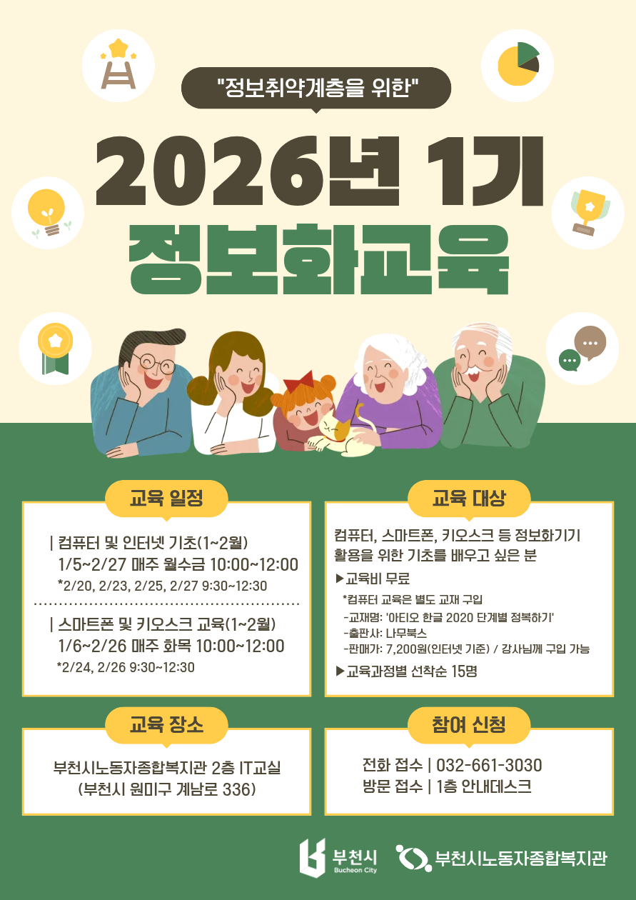 2026년 정보화교육 1기(1~2월) 수강생을 모집합니다. 컴퓨터, 스마트폰, 키오스크 등 일상 속 정보화기기 를 쉽고 편리하게 활용할 수 있도록 기초부터 함께 배우는 시간입니다. 많은 관심 부탁드립니다.