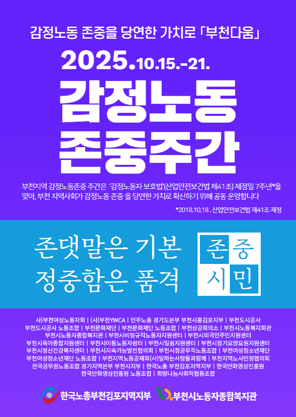 부천지역 감정노동존중 주간은 '감정노동자 보호법(산업안전보건법 제41조) 제정일 7주년을 맞아 부천 지역사회가 감정노동 존중을 당연한 가치로 확산하기 위해 공동 운영합니다. 모두가 감정노동을 주고받는 '감정노동사회' 속에서 일하는 사람이 안전하고 행복한 도시, 감정노동을 존중하는 부천시를 만들기 위해 일하는 모든 분들이 존중받고 서로의 감정을 이해하는 문화를 만들어 가고자 하오니 많은 관심 부탁드립니다.